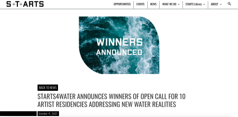 歐盟科技藝術平台「S+T+ARTS」的「STARTS4Water」徵件。圖片來源: https://starts.eu/article/detail/starts4water-announces-winners-of-open-call-for-10-artist-residencies-addressing-new-water-realities/